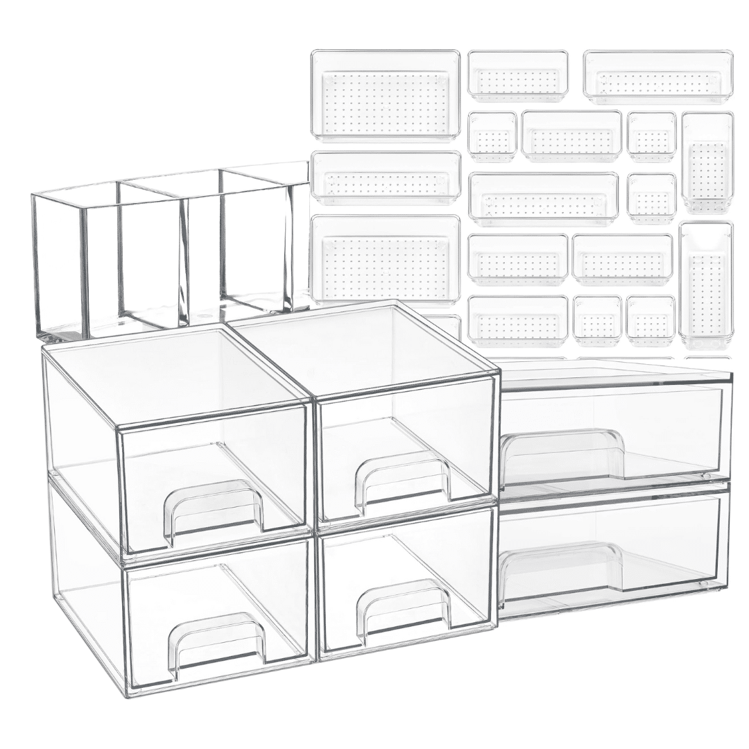 Plastic Storage Bins + Open Baskets – Perfect for reorganizing makeup, skincare, or beauty content creator gear.  Plus, its a thoughtful gift for beauty lovers who want a more organized routine. We all complain about needing to organize right?!
