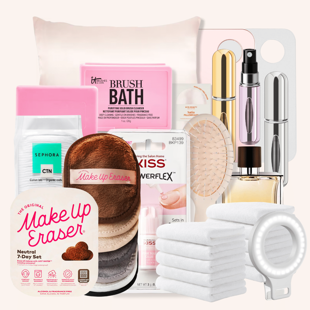 A small beauty emergency kit with products like: lash glue, mini scissors, tweezers, hair ties, a claw clip, lip balm, perfume, a makeup wipe, nail glue, and a Tide-to-Go pen is always a hit.  It’s relatively inexpensive to assemble but incredibly useful for travel, events, filming days, or everyday life.